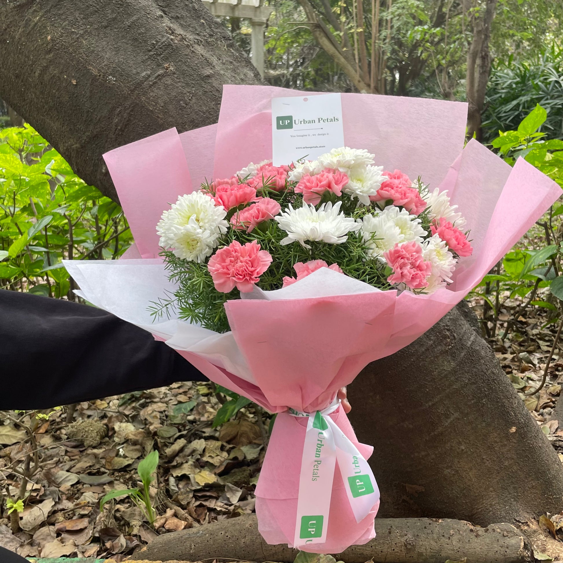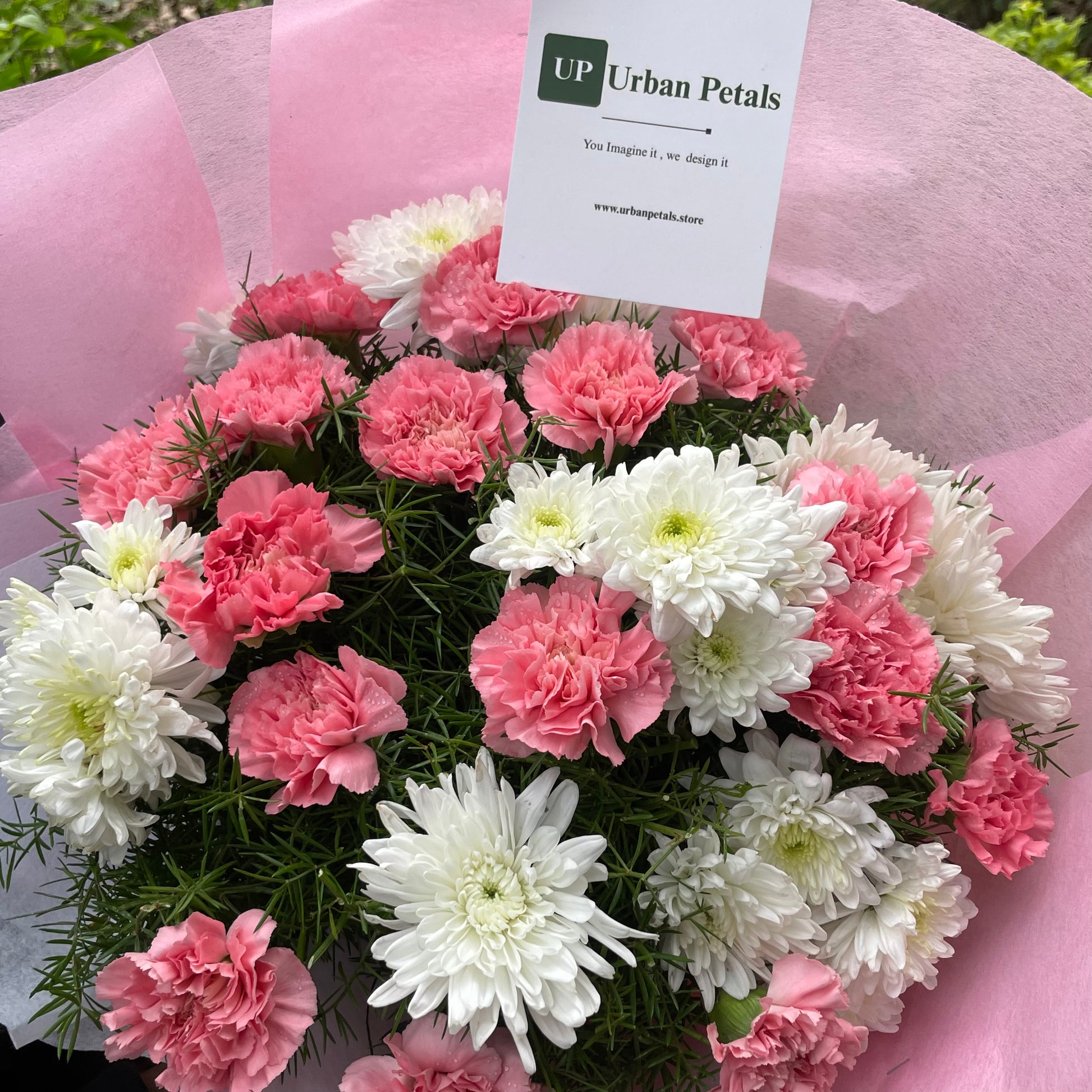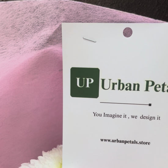 A graceful and contemporary bouquet crafted to delight, featuring soft pink carnations beautifully paired with fresh white chrysanthemums. Accented with a subtle touch of lush green fillers, the arrangement creates a charming balance of freshness, warmth, and gentle elegance. Thoughtfully finished with premium Korean-style pink wrapping that enhances the bouquet’s refined aesthetic and includes a complimentary Urban Petals branded message card for your personalised note.