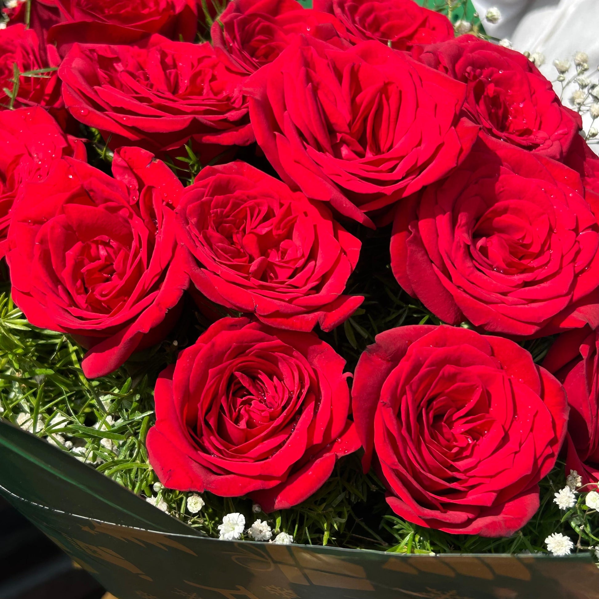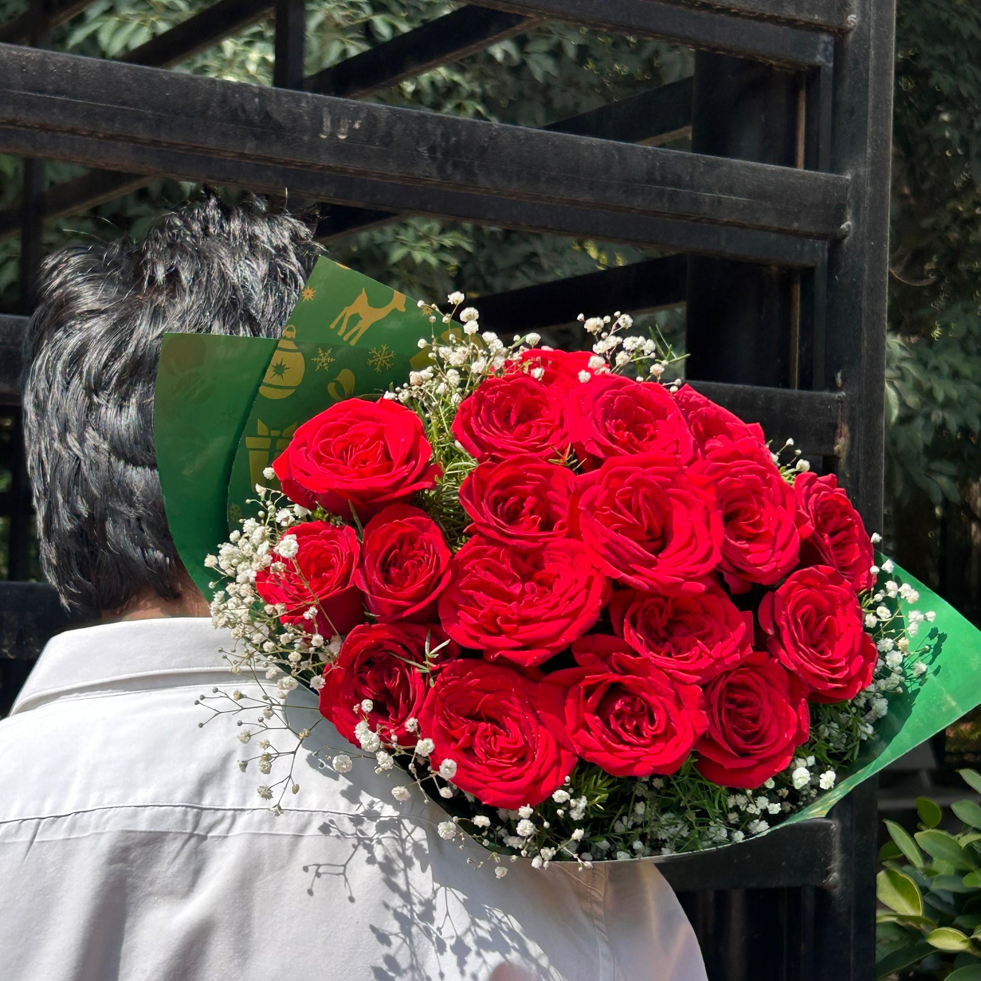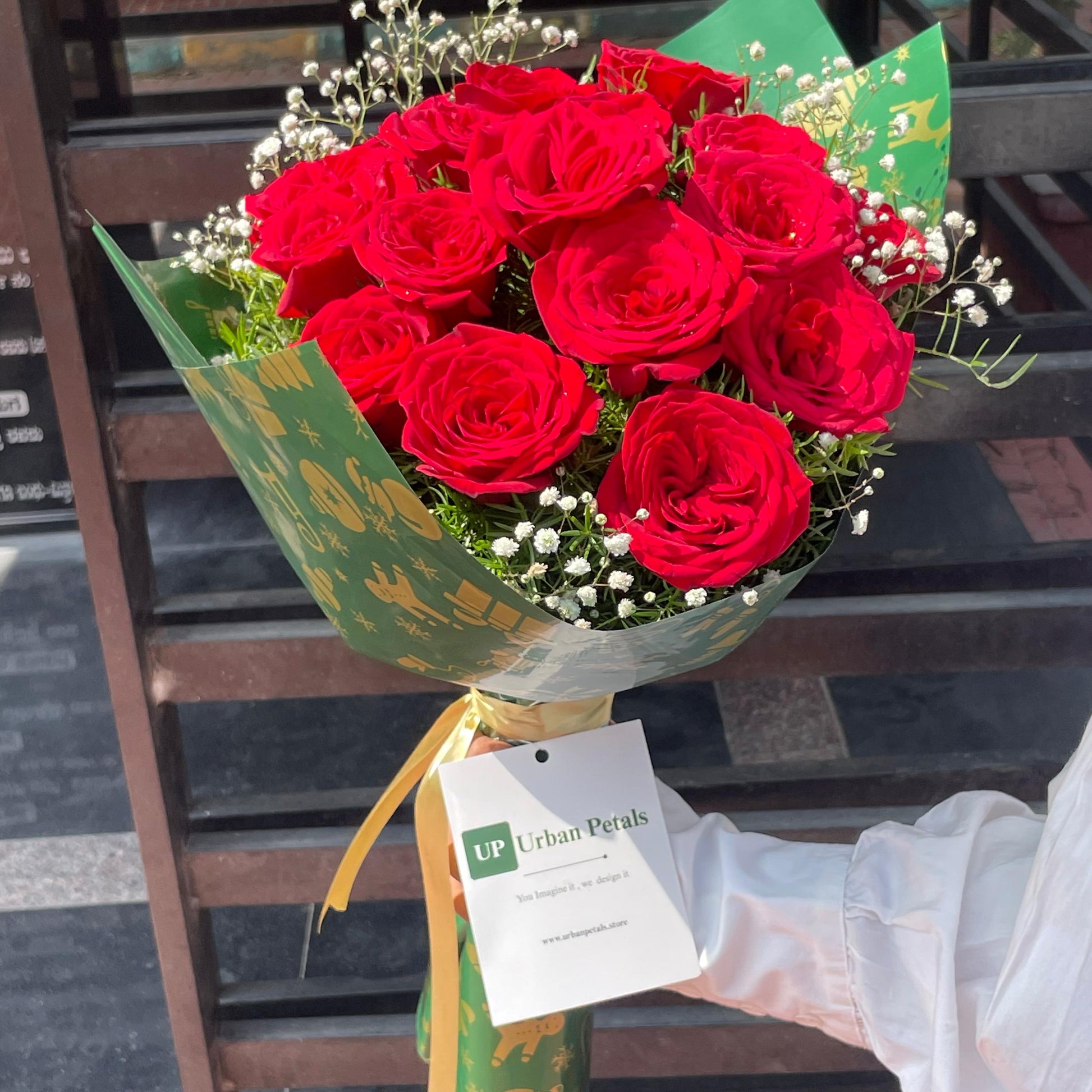 A timeless and romantic bouquet featuring rich red roses arranged for a bold, classic expression of love and admiration. Soft greenery accents add freshness and volume, enhancing the natural beauty of the roses. Elegantly wrapped in premium festive paper with a refined finish for a striking presentation. Comes with a complimentary Urban Petals branded message card for your personalised note.
