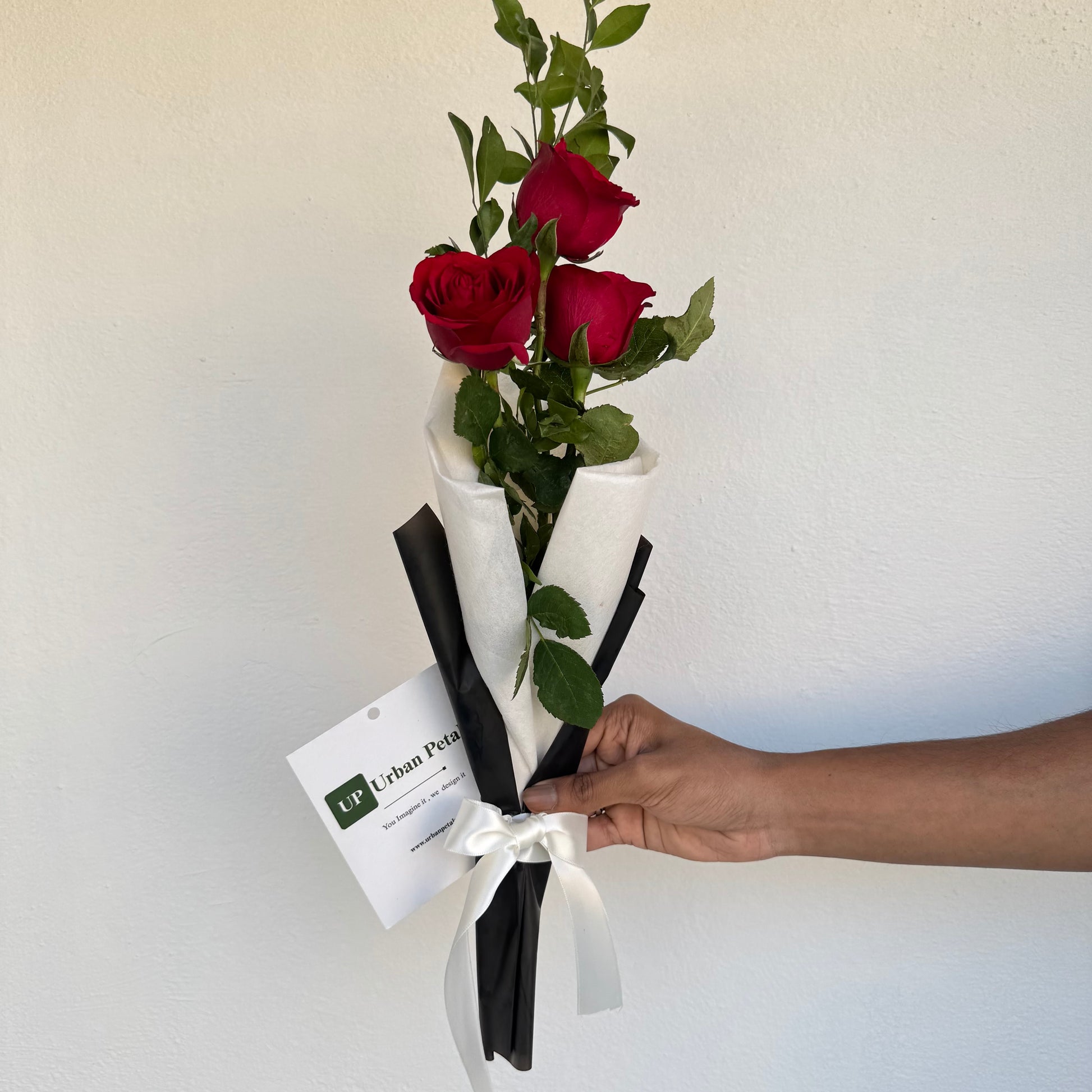 A minimal yet striking bouquet designed for timeless expression, featuring classic red roses paired with fragrant kamini foliage. Accented naturally with fresh green leaves, this arrangement offers a perfect balance of romance, simplicity, and elegance. Thoughtfully finished with premium Korean-style wrapping in a monochrome palette and includes a complimentary Urban Petals branded message card for your personalised note.