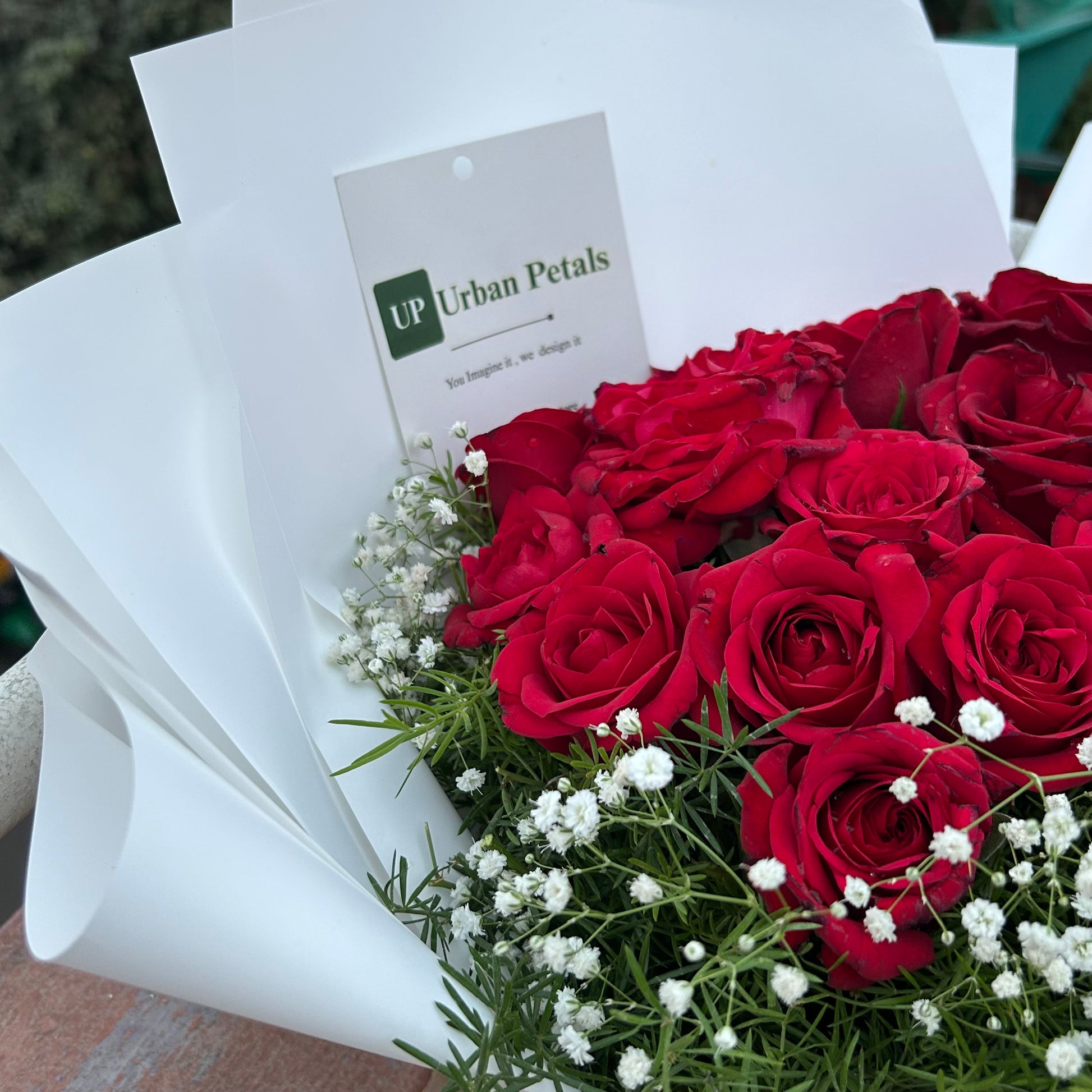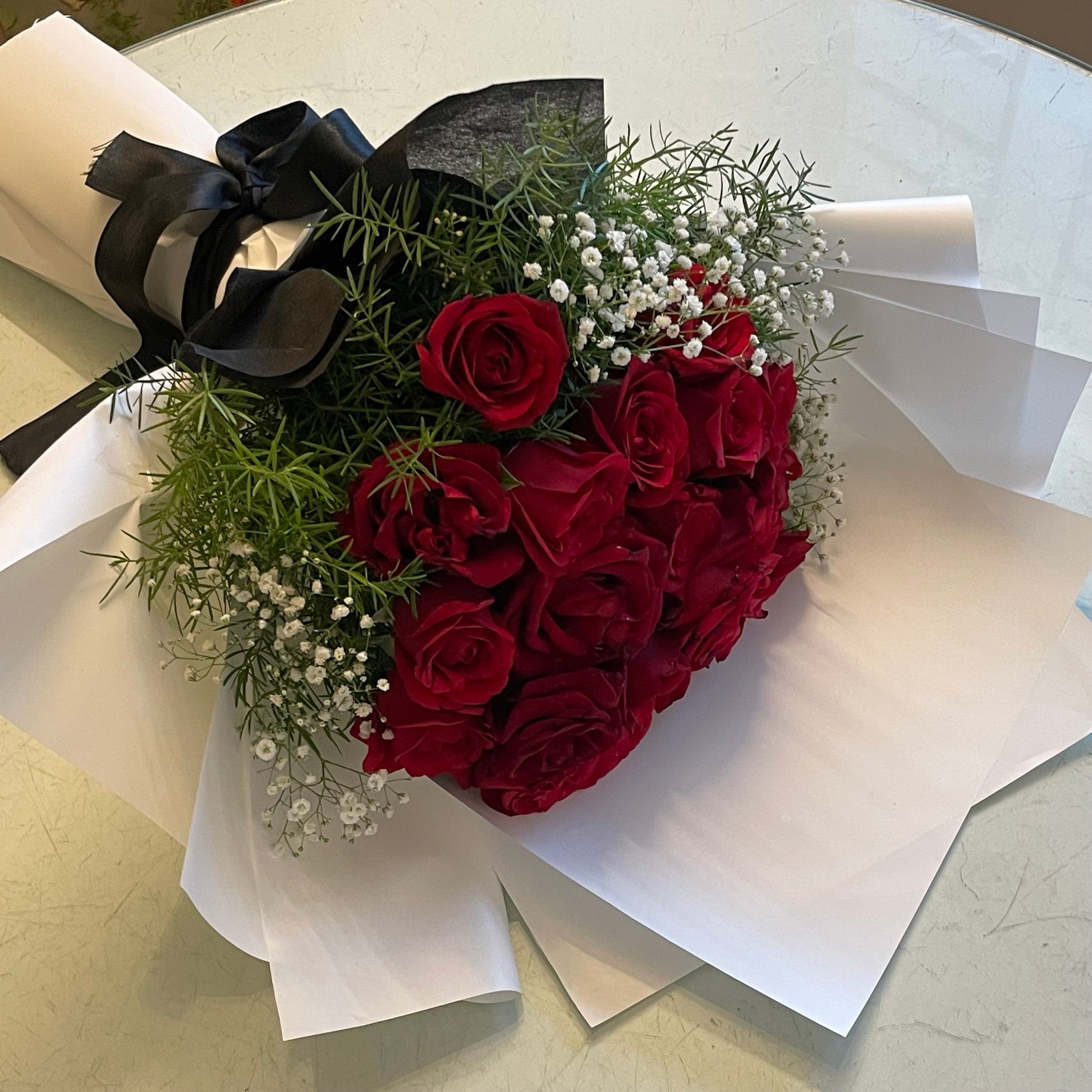 A luxurious and expressive bouquet designed to make a lasting impression, featuring twenty velvety red roses arranged in a striking heart-shaped style. Accented with delicate gypsophila and fresh green foliage, this arrangement embodies deep romance, passion, and timeless elegance. Thoughtfully finished with premium Korean-style white wrapping and a contrasting black ribbon, it includes a complimentary Urban Petals branded message card for your personalised note.