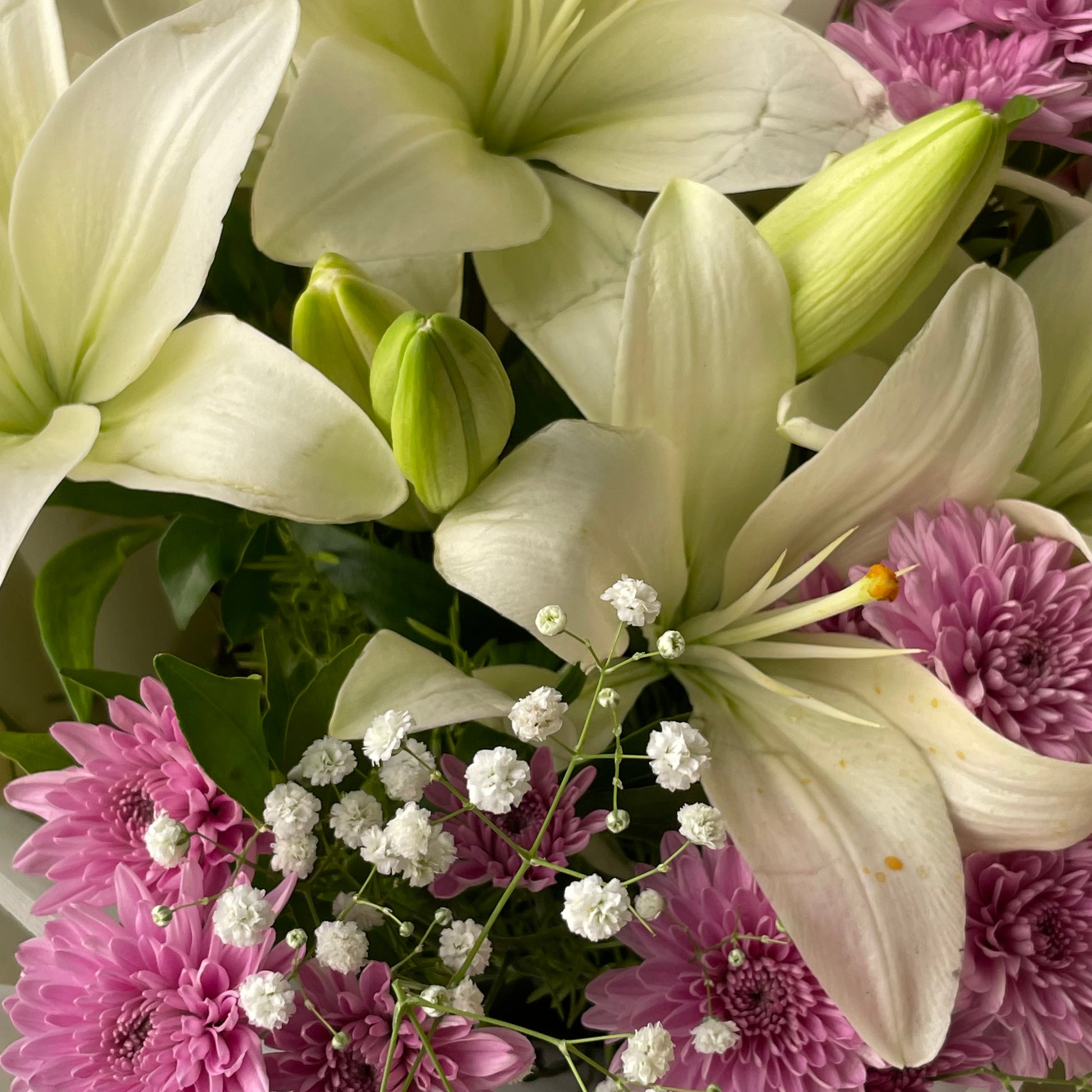 A graceful and contemporary bouquet crafted to charm, featuring pristine white lilies paired with soft pink chrysanthemums and delicate gypsophila. Accented with a light touch of fresh green foliage, the arrangement creates a harmonious blend of elegance, freshness, and subtle romance. Thoughtfully finished with premium Korean-style wrapping that enhances the bouquet’s refined aesthetic and includes a complimentary Urban Petals branded message card for your personalised note.