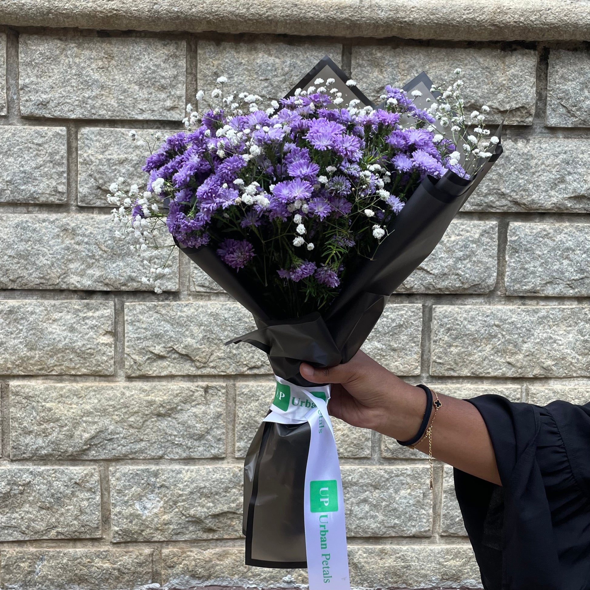 A graceful and contemporary bouquet crafted to delight, featuring a lush bunch of purple daisies known for their calming charm and elegant appeal. Accented with delicate white floral fillers and a light touch of fresh green foliage, the arrangement offers a soothing blend of freshness and subtle sophistication. Thoughtfully finished with premium Korean-style wrapping that enhances the bouquet’s refined aesthetic and includes a complimentary Urban Petals branded message card for your personalised note.