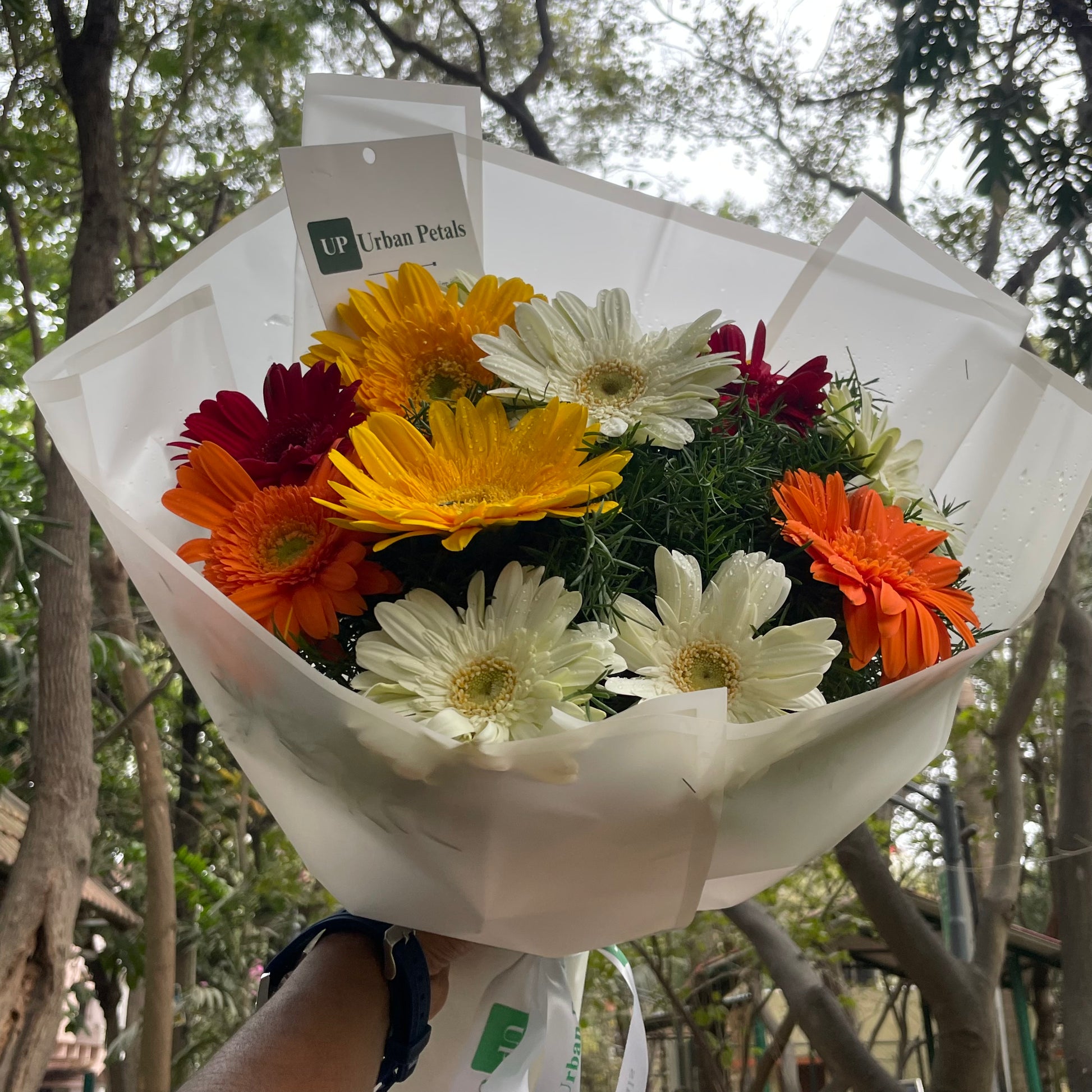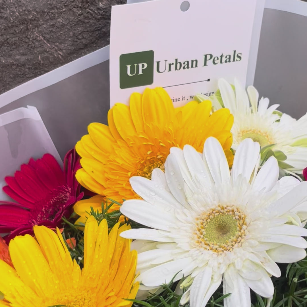 A vibrant and contemporary bouquet crafted to uplift the spirit, featuring a cheerful mix of red, orange, yellow, and white gerberas (jalpara). Accented with lush green fillers, the arrangement creates a lively blend of freshness, warmth, and joyful charm. Thoughtfully finished with premium Korean-style translucent wrapping that enhances the bouquet’s modern aesthetic and includes a complimentary Urban Petals branded message card for your personalised note.