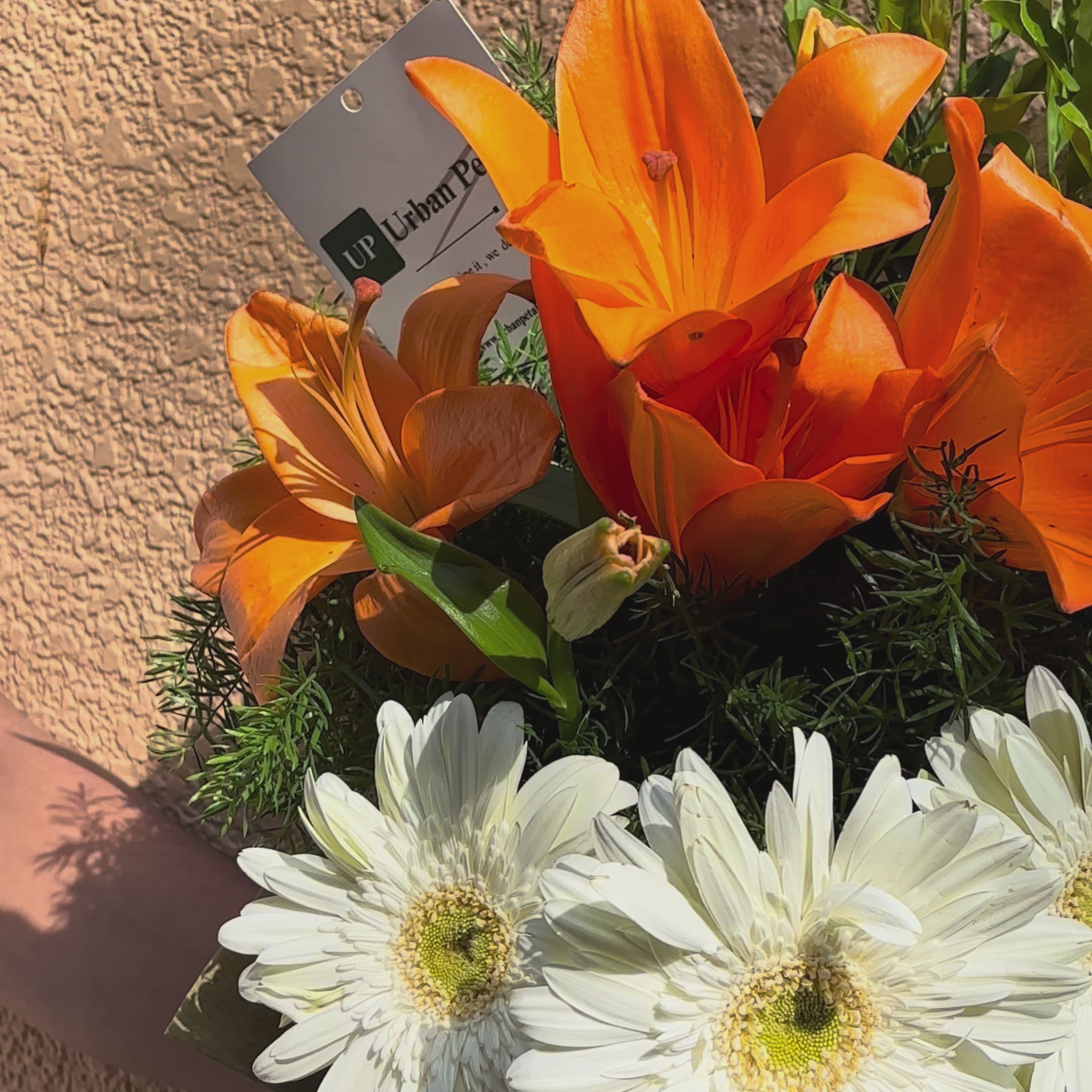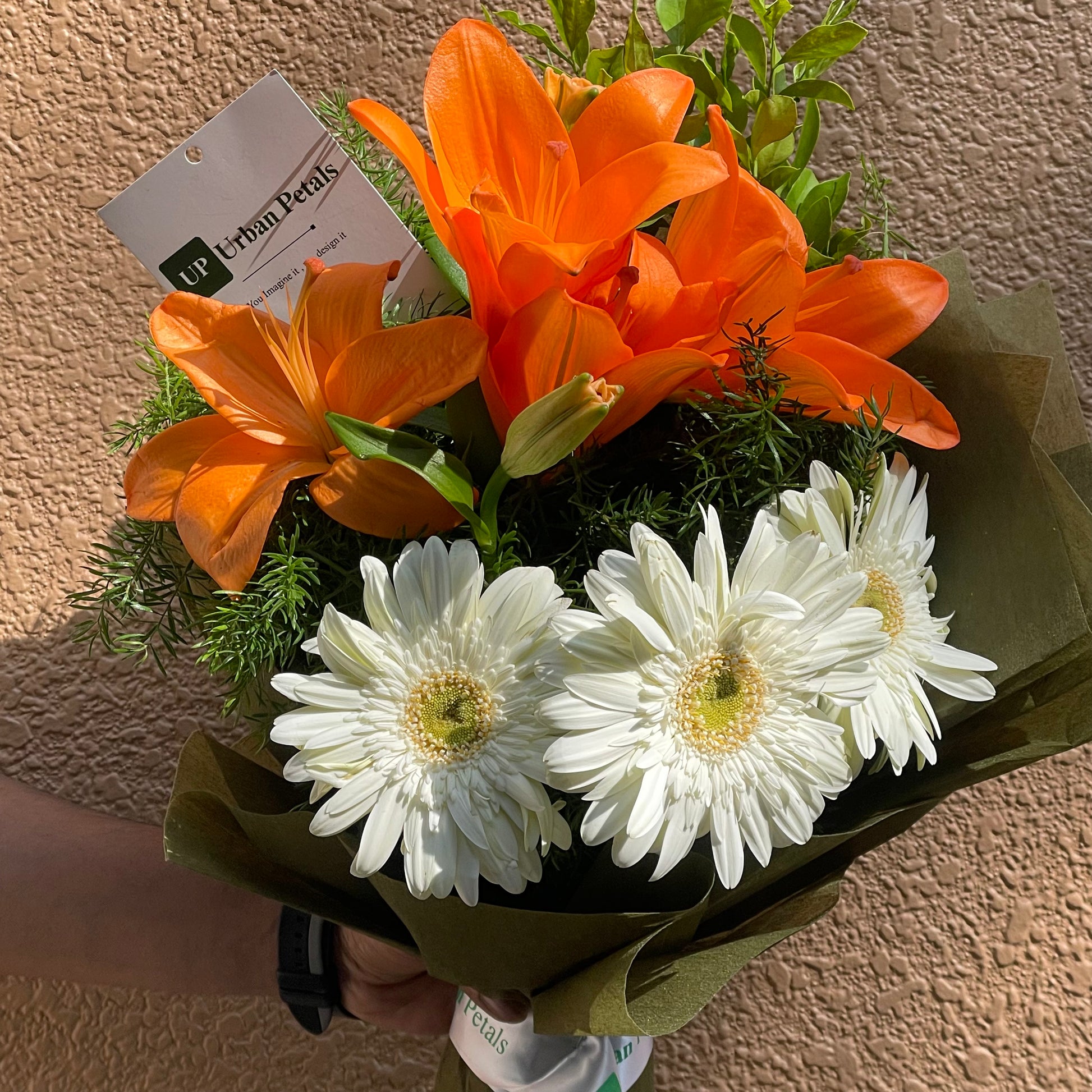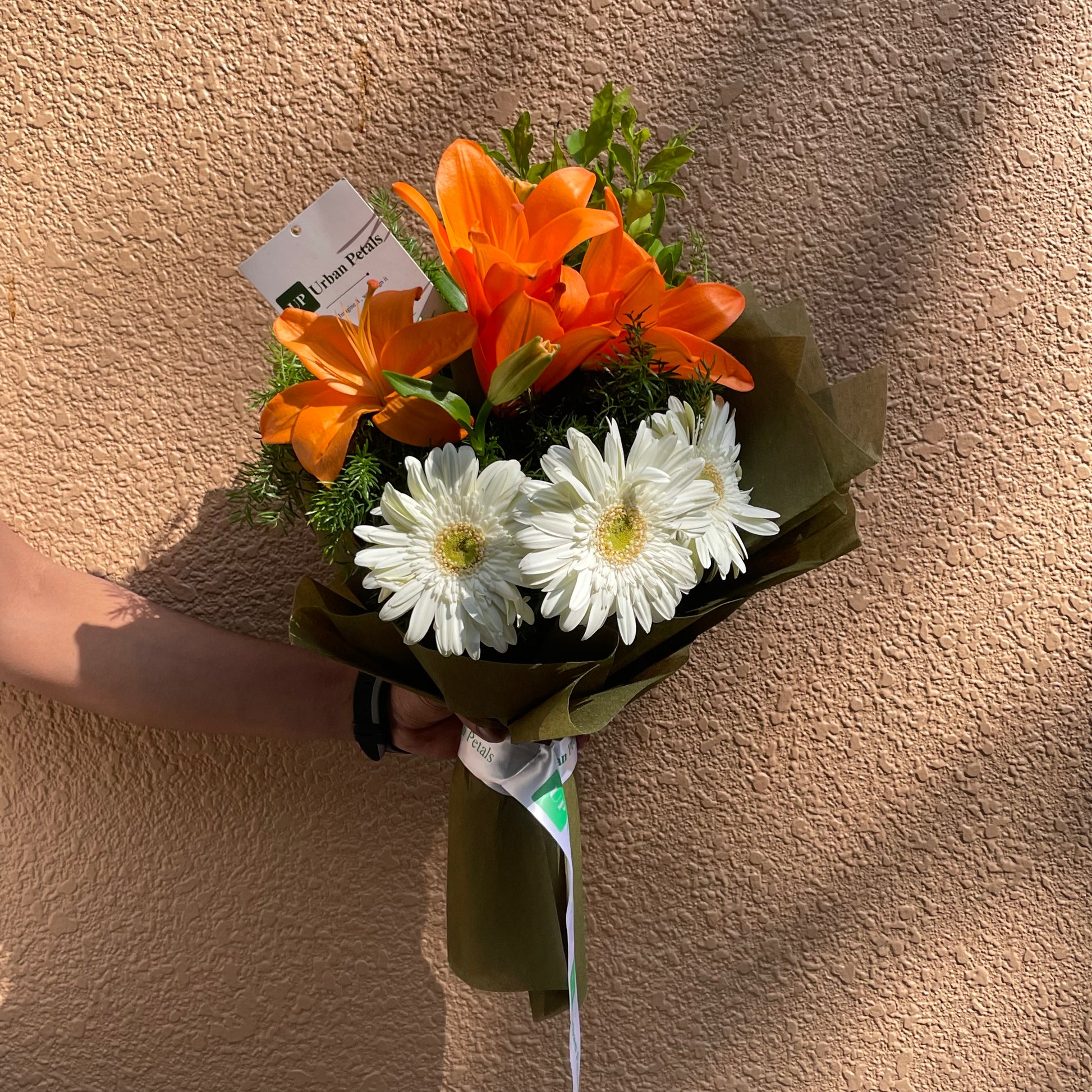 A fresh and contemporary bouquet crafted to brighten any moment, featuring elegant white gerbera paired with vibrant orange tulips. Accented with a light touch of fresh green foliage, the arrangement creates a beautiful balance of freshness, warmth, and modern charm. Thoughtfully finished with premium Korean-style wrapping that enhances the bouquet’s refined aesthetic and includes a complimentary Urban Petals branded message card for your personalised note.
